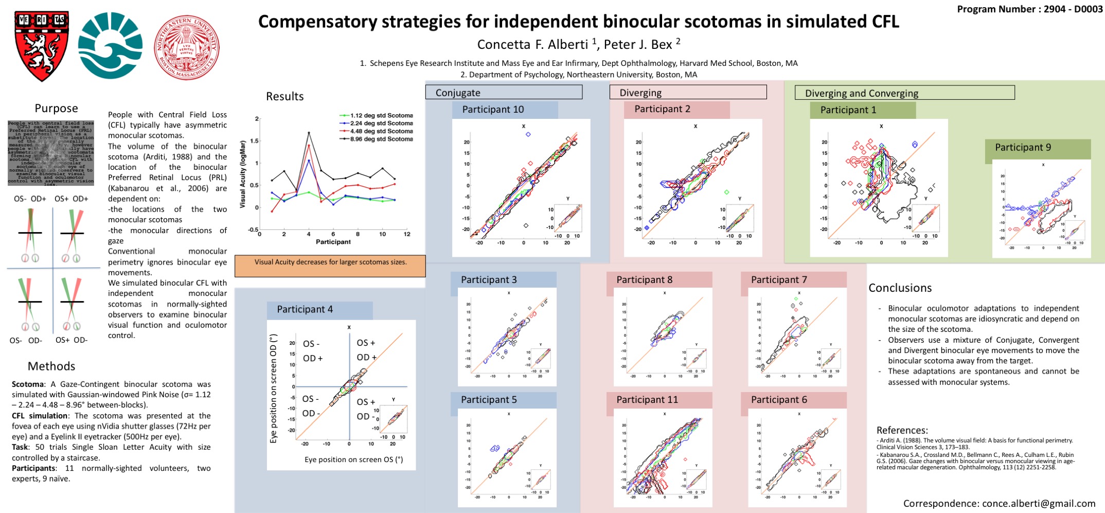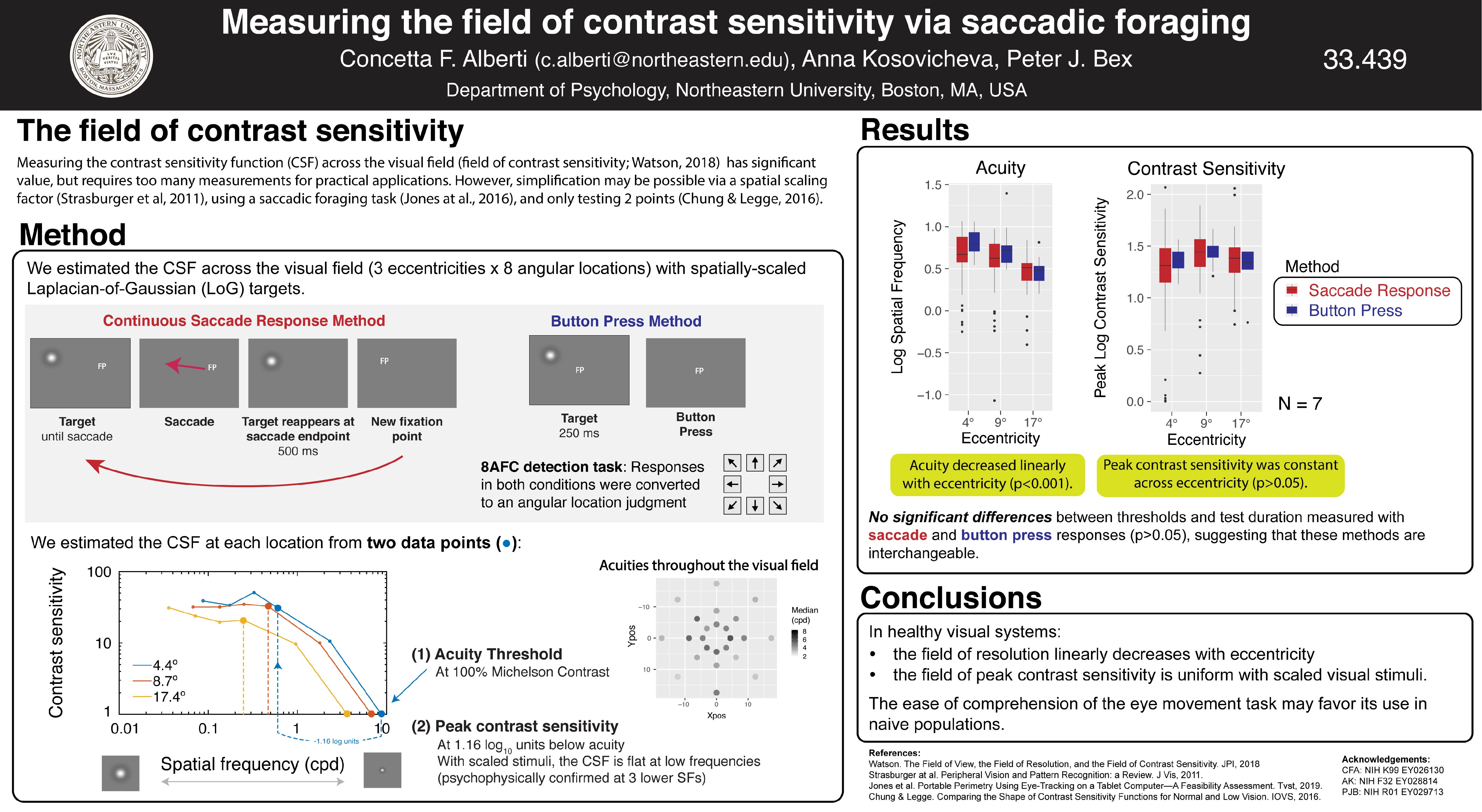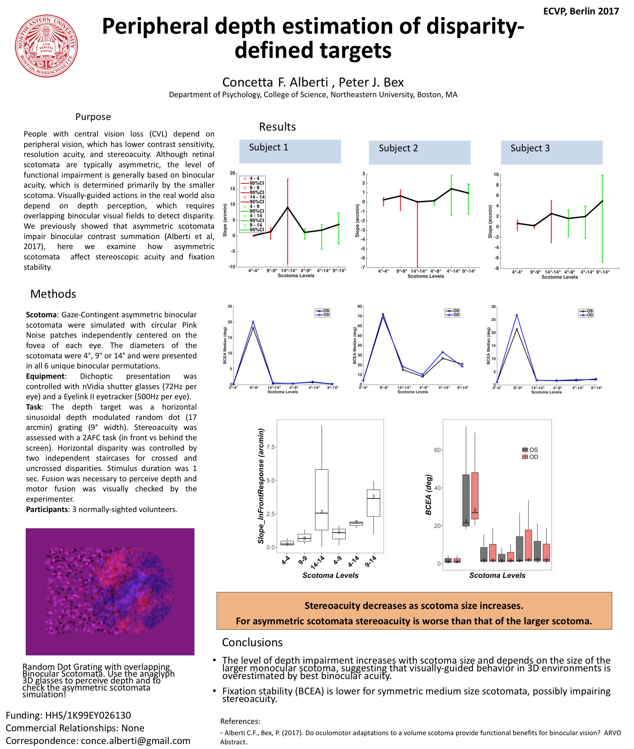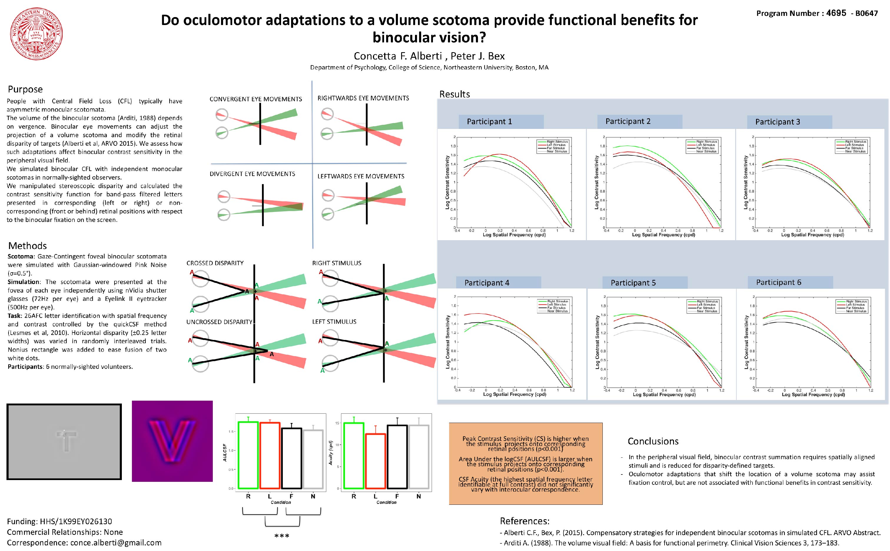 • Alberti, C.F., Bex, P.J. (2018). Binocular contrast summation and inhibition depends on spatial frequency, eccentricity and binocular disparity. Ophthalmic and Physiological Optics. 38(5):525-537. pdf